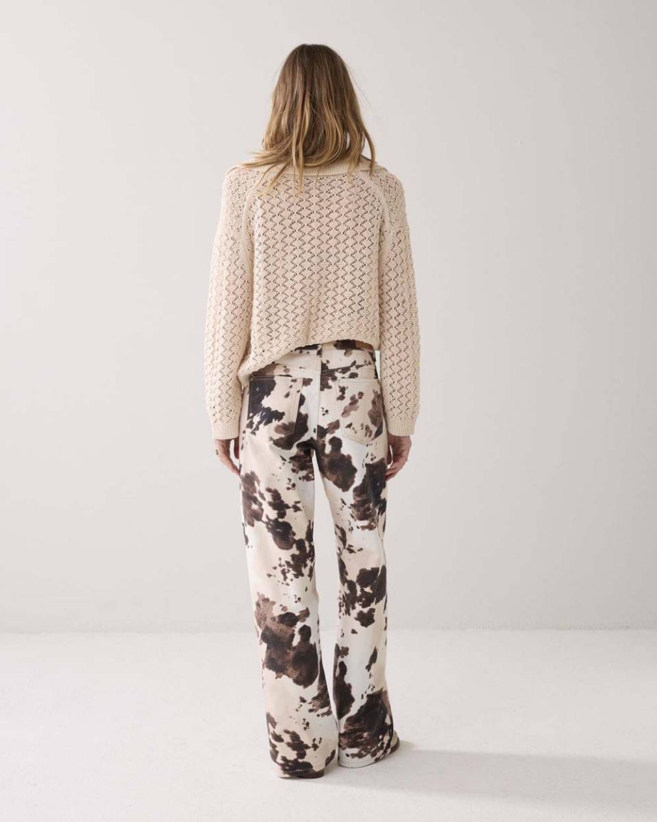 Maak een fashion statement met de unieke koeienprint. Deze speelse en gedurfde print voegt net dat beetje extra toe aan je outfit en laat je gegarandeerd opvallen in de menigte. De meerkleurige print is veelzijdig te combineren met verschillende tops en accessoires voor diverse looks.