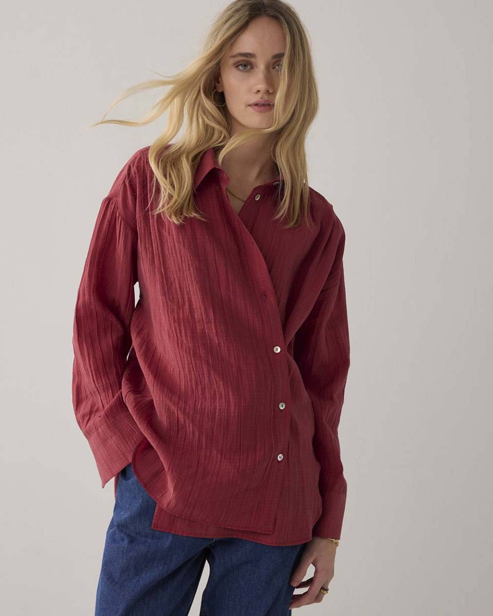 Stijlvolle damesblouse van Summum Woman in een warme baksteenrode kleur. Gemaakt van een lyocell blend voor een zachte en comfortabele pasvorm. Deze veelzijdige blouse heeft twee sluitopties: draag hem casual met de gebruikelijke knoopsluiting of kies voor een getailleerde look met de zijsluiting. Perfect voor elke gelegenheid!