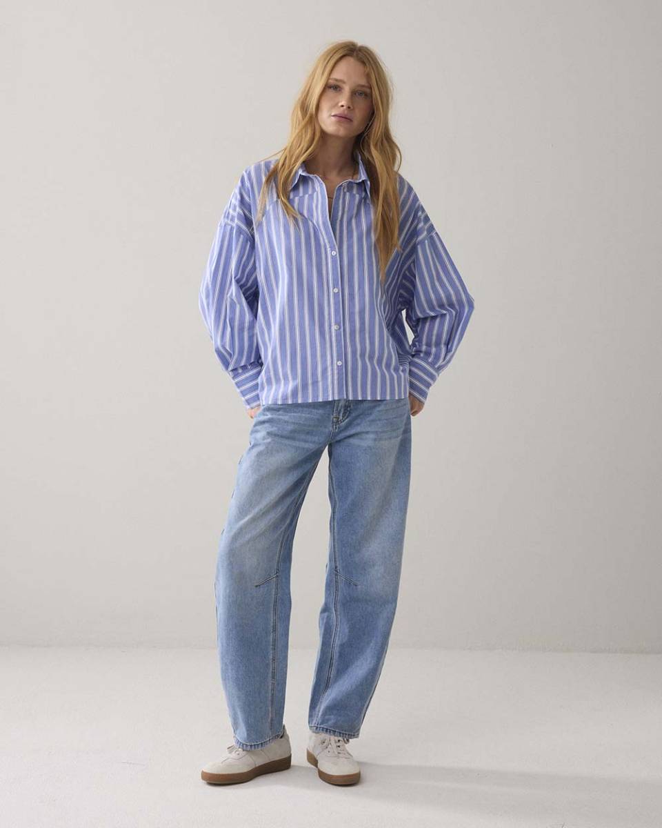 Stijlvolle dames blouse met zachte blauwe strepen van Summum Woman. Gemaakt van 100% katoen, biedt deze blouse een comfortabele en ademende pasvorm. Perfect voor zowel casual als zakelijke gelegenheden, met een tijdloos design dat moeiteloos combineert met elke garderobe.