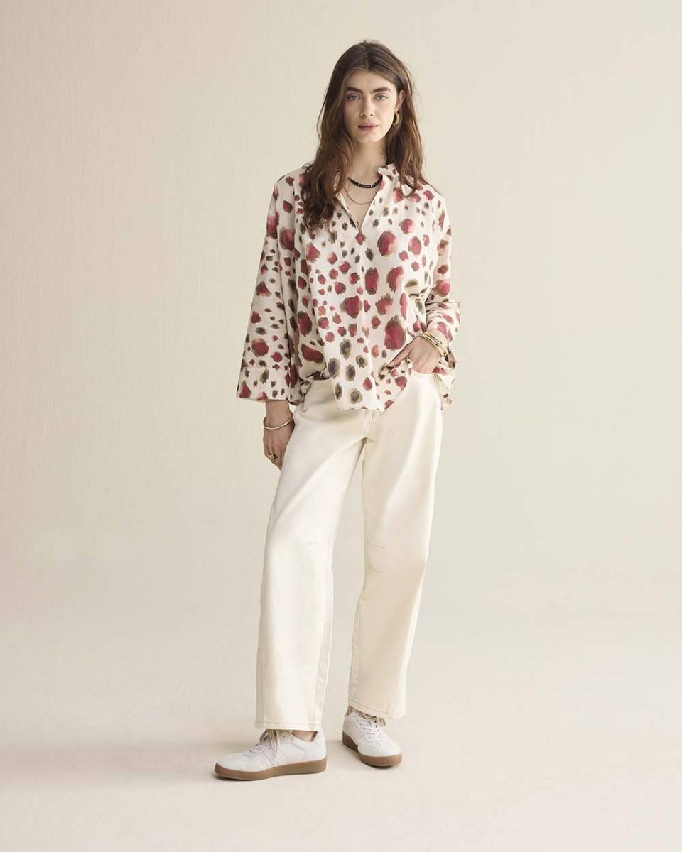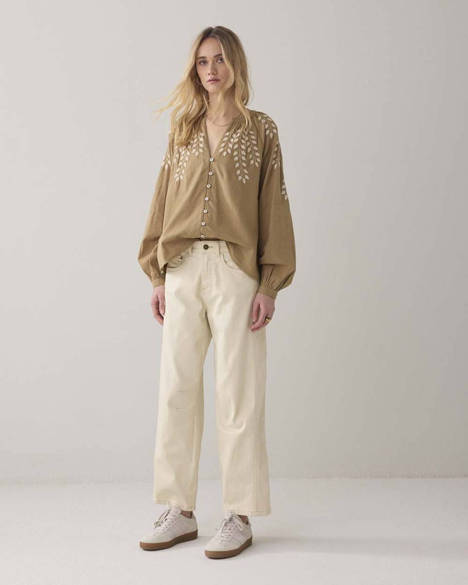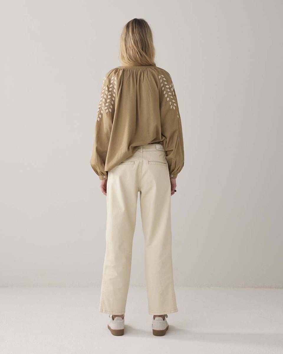 Deze Cocoon pant heeft een tijdloze uitstraling dankzij de subtiele ivoren kleur en de verfijnde twill structuur. De broek heeft een losse fit rond de heupen en loopt taps toe naar de enkels, wat zorgt voor een eigentijdse look. De stevige tailleband met rits en knoopsluiting voegt extra comfort toe.