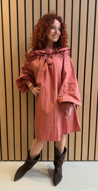 Het unieke ontwerp van deze jurk valt direct op door zijn oversized pasvorm, waardoor het een comfortabele maar toch stijlvolle optie is voor verschillende gelegenheden. Het strikdetail voegt een speelse touch toe die de jurk helemaal afmaakt.
