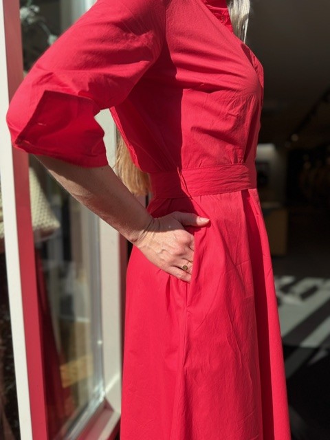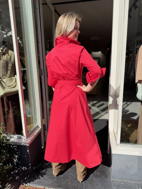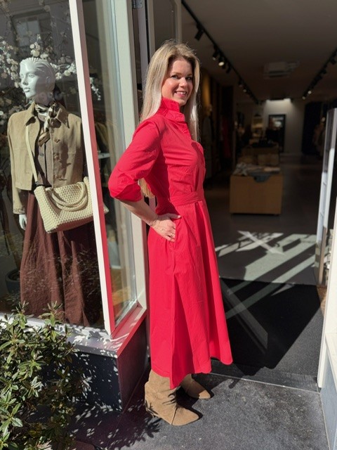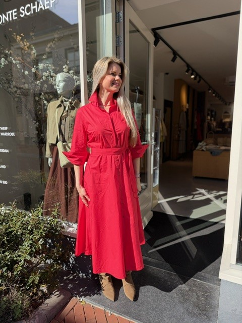 Stralend in fluo rood, de Noman’sland jurk is een perfecte combinatie van stijl en comfort. Gemaakt van 100% katoen, biedt deze maxi-jurk een luchtige pasvorm met een elegante kraag en lange mouwen. Ideaal voor elke gelegenheid, voegt dit veelzijdige kledingstuk een vleugje levendigheid aan je garderobe toe.
