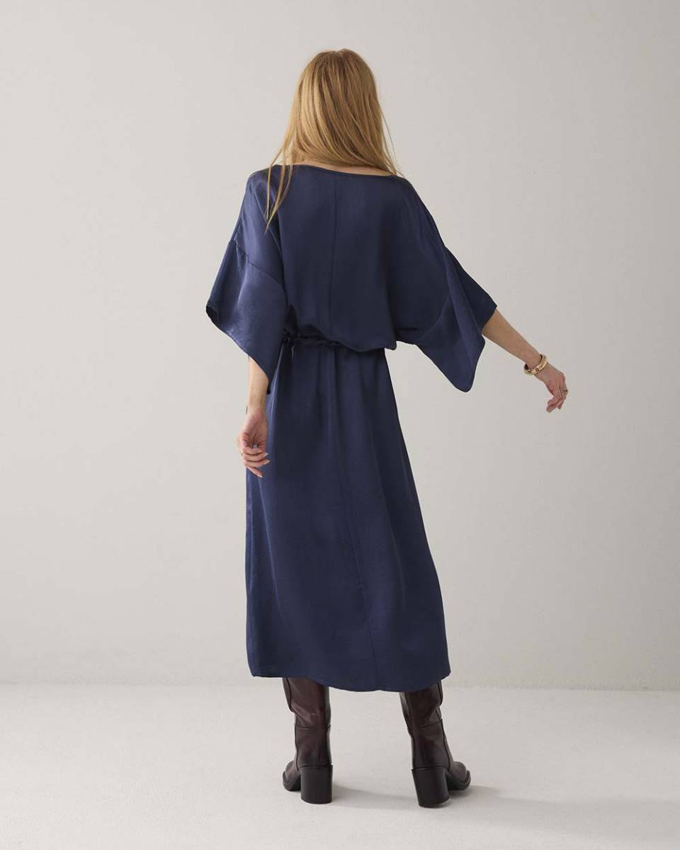 Deze jurk komt in een klassieke navy noir kleur, ideaal voor het creëren van tijdloze looks. Combineer het met opvallende accessoires of houd het simpel voor een elegante uitstraling. De veelzijdigheid van deze kleur maakt het eenvoudig te matchen met verschillende schoenen en sieraden om je look compleet te maken.