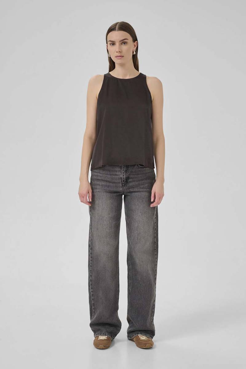 De Estelle top van My Essential Wardrobe in een elegante espresso tint is een must-have voor elke garderobe. Zijn A-lijn ontwerp in combinatie met de mouwloze snit zorgt voor een tijdloze en veelzijdige look, ideaal voor zowel casual als formele gelegenheden. Deze top biedt u het ultieme draagcomfort en een flatterende pasvorm.