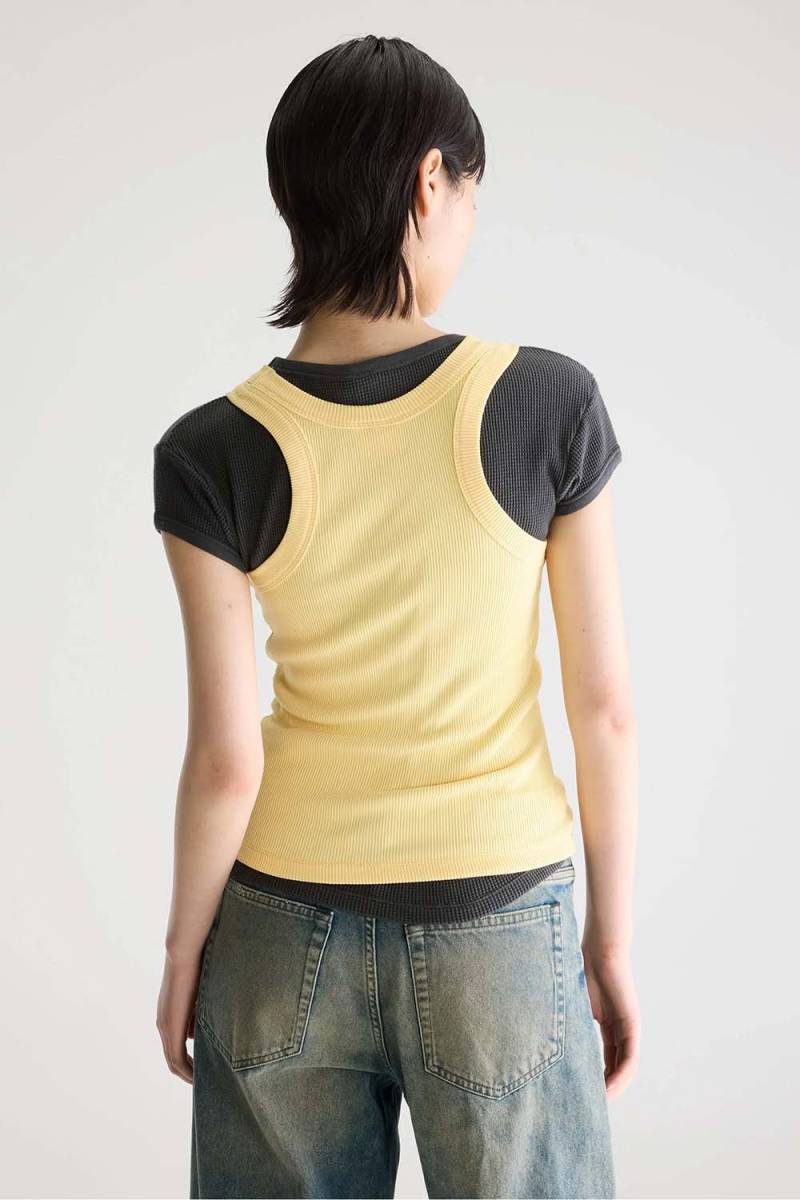 De BELLEROSE Fikas tanktop in de kleur ‘butter yellow’ is een veelzijdig kledingstuk dat elke garderobe opvrolijkt. De zachte gele tint geeft een frisse en vrolijke uitstraling, perfect voor de warmere maanden of als kleurrijke laag onder een jasje in de winter.