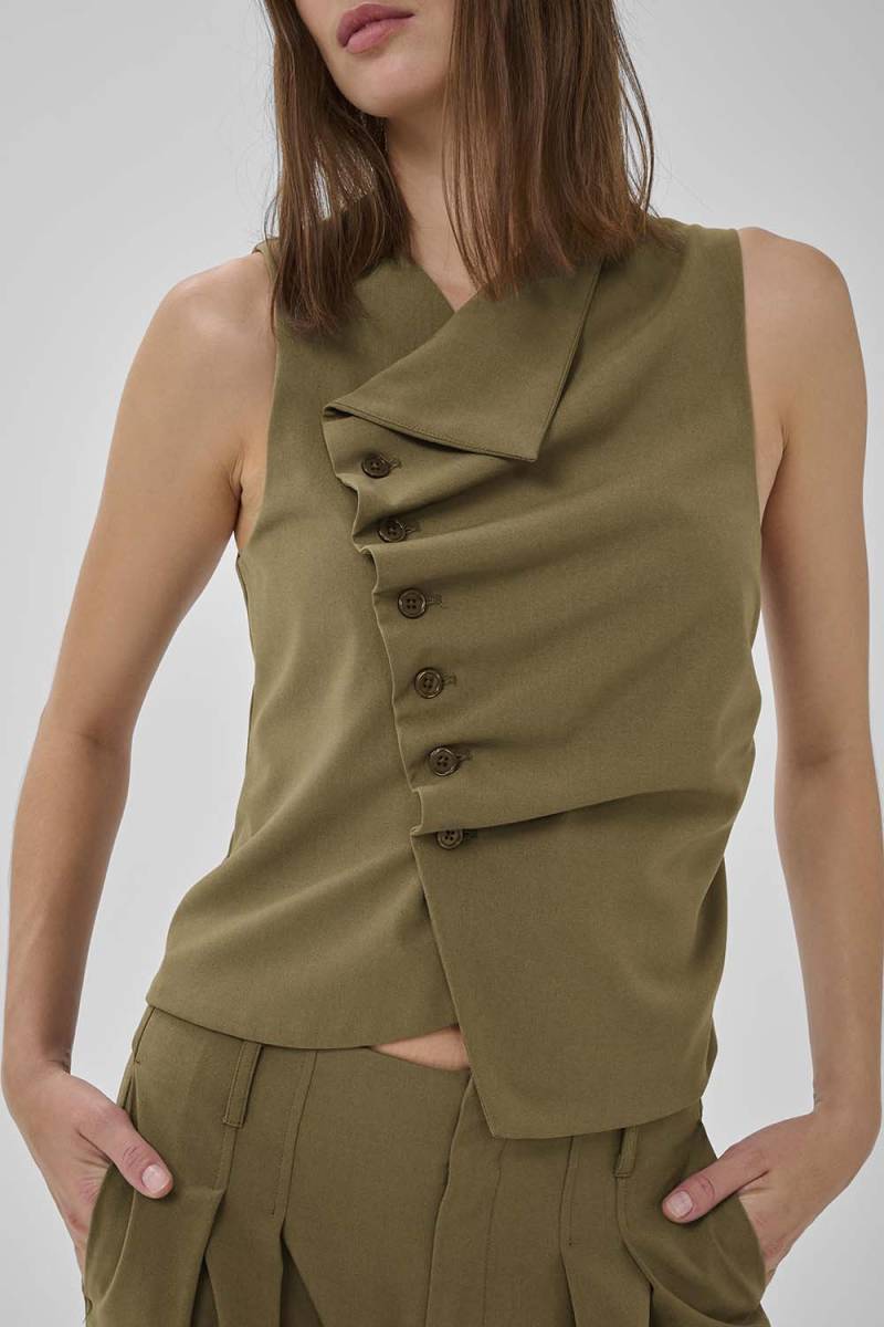 Ontdek de stijlvolle Hace gilet in de prachtige kleur capers van My Essential Wardrobe. Dit veelzijdige kledingstuk voegt direct een vleugje elegantie toe aan elke outfit. Of je het nu combineert met een blouse voor een zakelijke look of met een casual T-shirt voor een ontspannen dagje uit, deze gilet biedt talloze stylingopties.