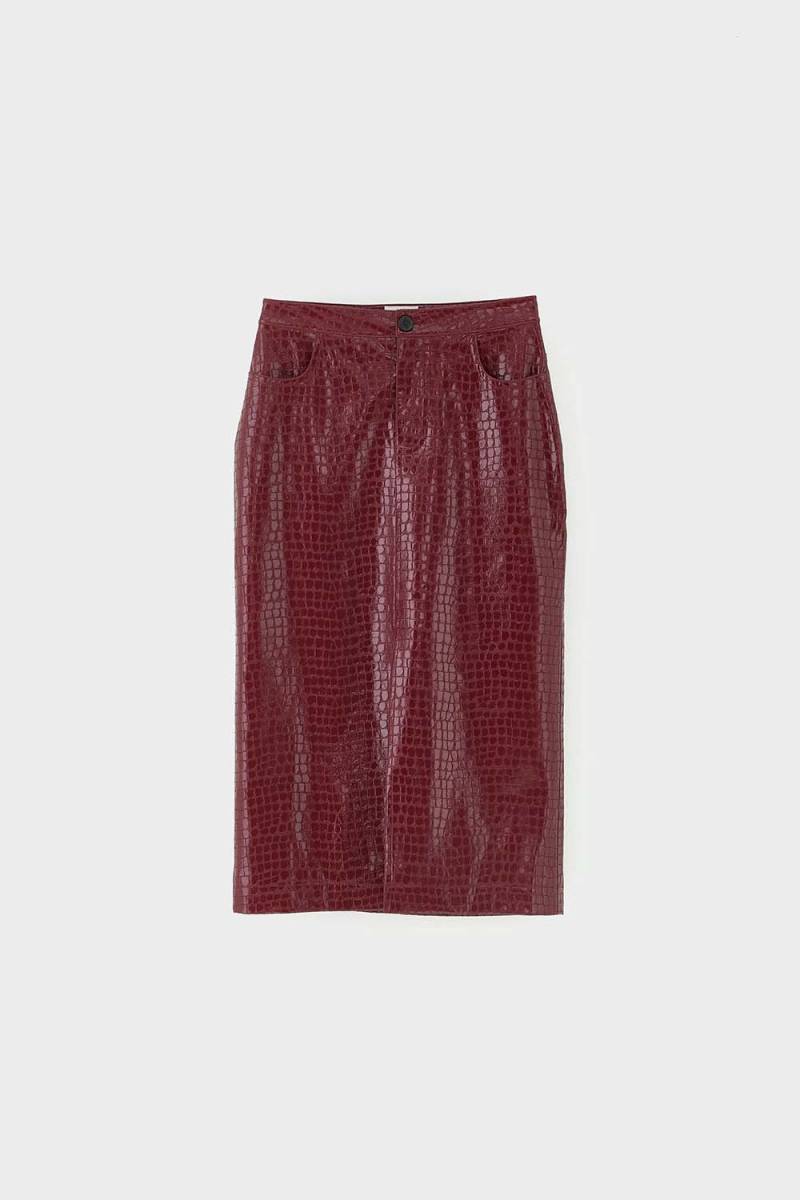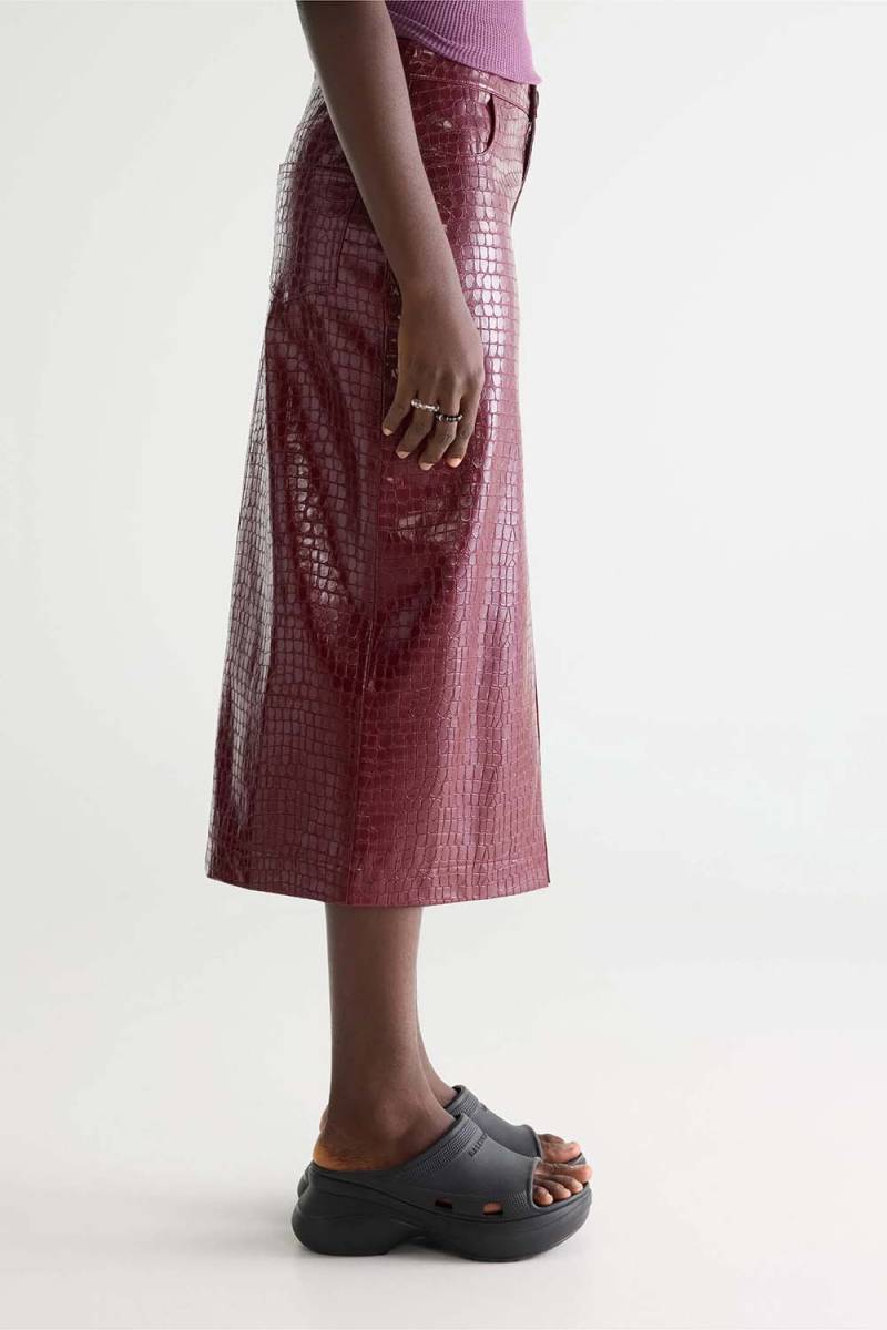 De Halina rok beschikt over een elegant en modern design dat zeker in het oog springt. Het croco effect voegt een subtiele textuur toe die de algehele uitstraling van de rok naar een hoger niveau tilt. Combineer deze rok met je favoriete blouse of top voor een complete look.