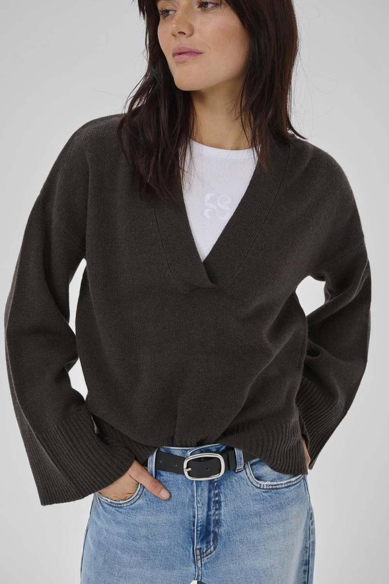 De Huxi v-neck pullover espresso van My Essential Wardrobe is een stijlvolle en elegante aanvulling op je kledingkast. Gemaakt van 95% wol en 5% kasjmier, biedt deze trui een luxueuze zachtheid en warmte, perfect voor de koelere dagen. Met zijn klassieke v-hals en verfijnde espresso-kleur is het een veelzijdig stuk dat zowel casual als chic gedragen kan worden. Geniet van comfort en stijl met deze hoogwaardige pullover.