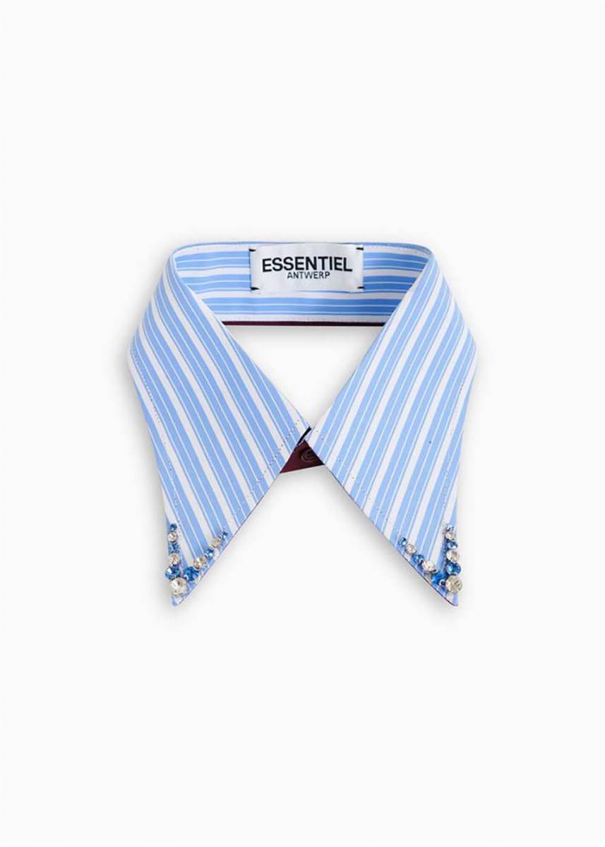 De Essentiel Antwerp Iplain kraag met rhinestone is een elegante toevoeging aan elke damesgarderobe. Gemaakt van 100% lichte, niet-rekbare katoenen stof, biedt dit kraagje extra stijl. De blauwe en witte kleurstelling wordt verfraaid met glazen stras, die een vleugje glamour toevoegen. Met een handige knoopsluiting is deze kraag zowel mooi als praktisch. Perfect voor een verfijnde look!