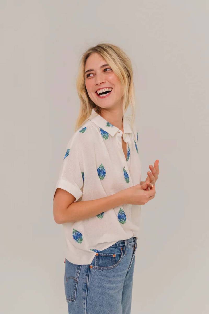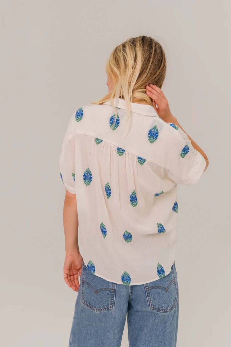 De SACRECOEUR Louisa Uxua blouse is een stijlvolle en veelzijdige toevoeging aan je garderobe. Deze opvallende blouse is voorzien van een korte mouw en een kraag, wat zorgt voor een elegante uitstraling. De prachtige print in blauw en groen geeft de blouse een frisse en moderne look, perfect voor zowel casual als formele gelegenheden.