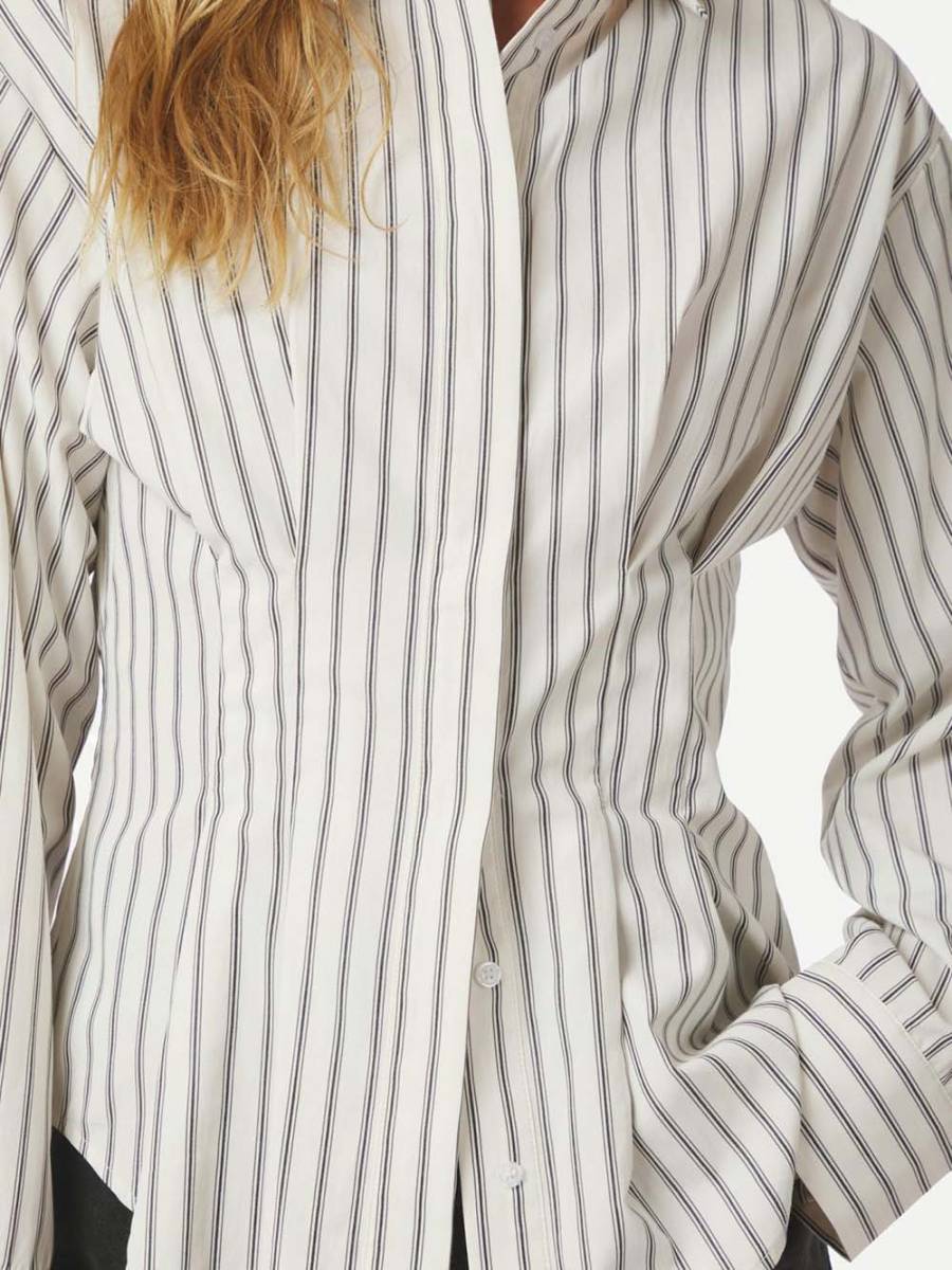 Combineer deze blouse met een zwarte broek voor een klassieke look of draag hem met een spijkerbroek voor een meer ontspannen stijl. Voeg eenvoudige accessoires toe om de focus op de verfijnde streepdetails te houden.