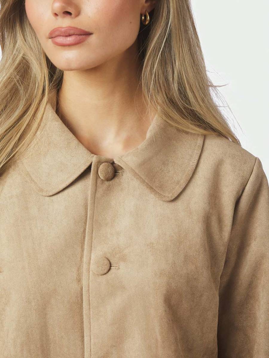 Deze jas is ontworpen met oog voor detail. De faux suede stof geeft het een luxueuze uitstraling, terwijl de subtiele snit ervoor zorgt dat het jasje prachtig valt over elk silhouet. Het ontwerp is tijdloos, waardoor je er seizoen na seizoen plezier van zult hebben.
