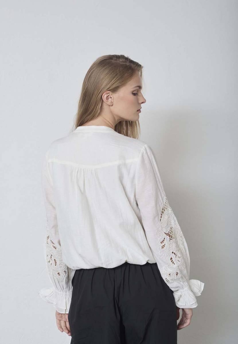 De Stina blouse van Co’Couture komt in een tijdloze off white kleur en is voorzien van prachtige geborduurde mouwdetails. De blouse heeft een klassieke ronde hals en een losse pasvorm, wat comfort en stijl combineert.
