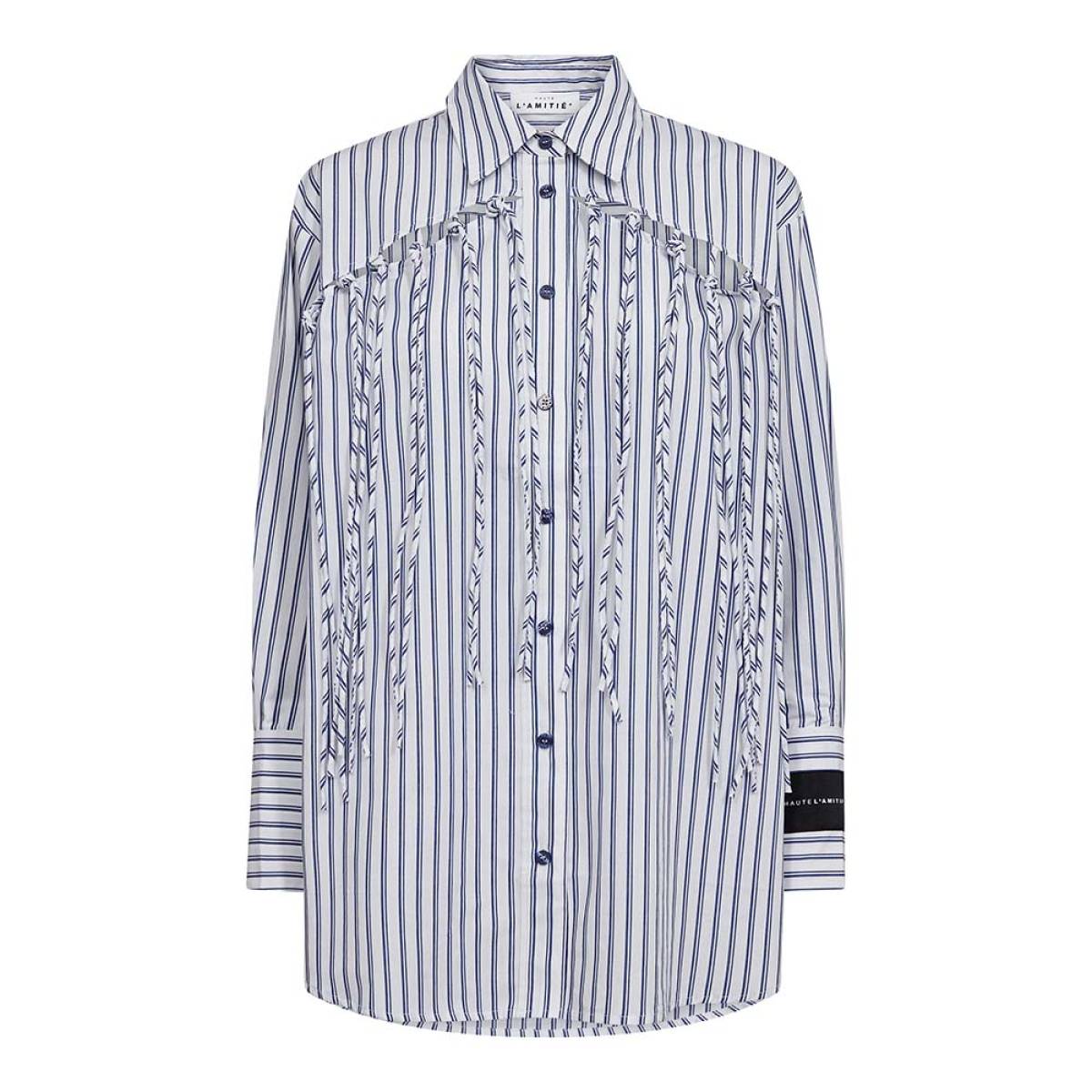 De Haute L’Amitie Striped Fringe Blouse in blauw en wit is een modestatement dat klasse en stijl ademt. Deze blouse heeft een oversized fit, wat zorgt voor een nonchalante maar toch verfijnde look. Het streeppatroon in combinatie met de speelse franjes voegt een uniek tintje toe aan je garderobe.