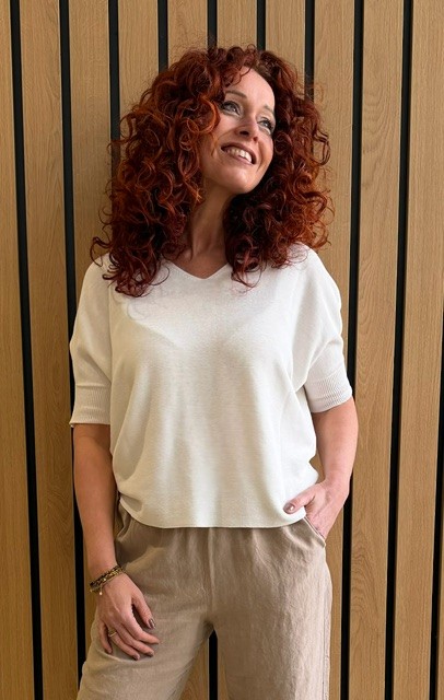 De sweater biedt een relaxte pasvorm die perfect is voor een casual maar verfijnde look. De korte mouwen en de ronde halslijn maken het veelzijdig voor verschillende gelegenheden en seizoenen.