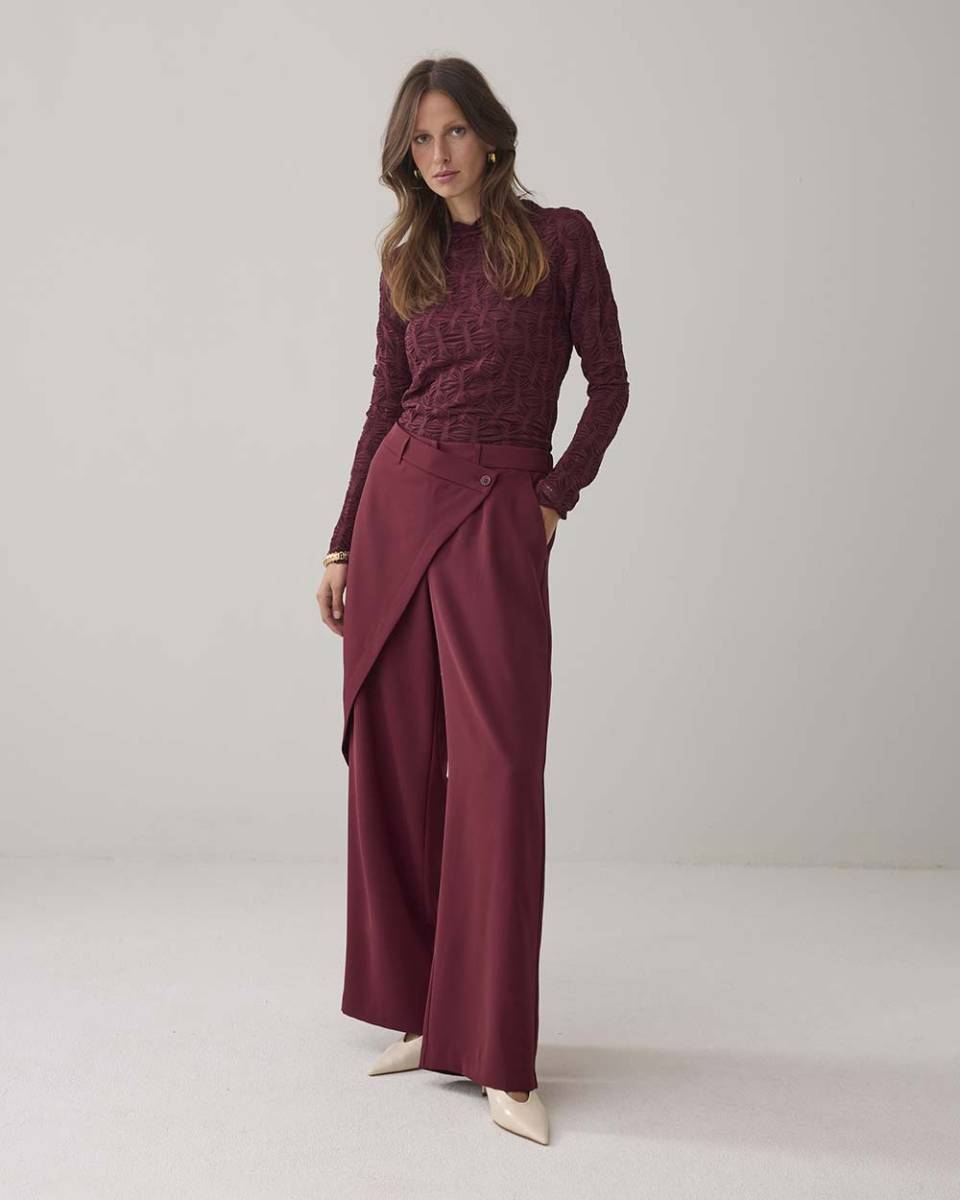 De top heeft een opvallend spiderweb mesh patroon dat een speelse en toch chique uitstraling geeft. De merlot kleur voegt een warme, luxe tint toe die makkelijk combineert met verschillende kledingstukken en accessoires.