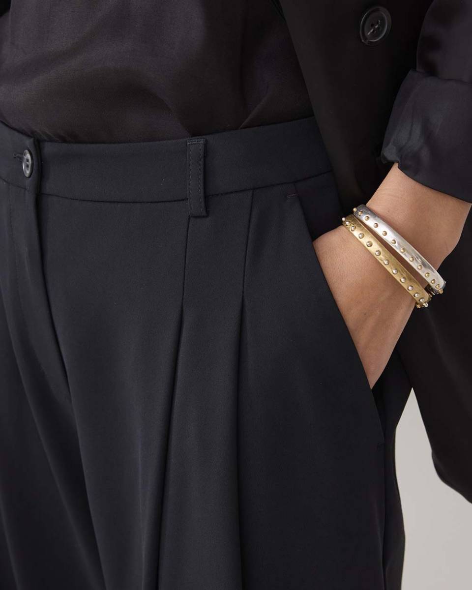 Ontdek de tijdloze elegantie van de zwarte wide fluid trousers van Summum Woman. Deze broek is ontworpen voor de moderne vrouw die houdt van comfort zonder in te boeten op stijl. Of je nu naar kantoor gaat of een avondje uit, deze broek biedt de perfecte mix van eenvoud en elegantie.