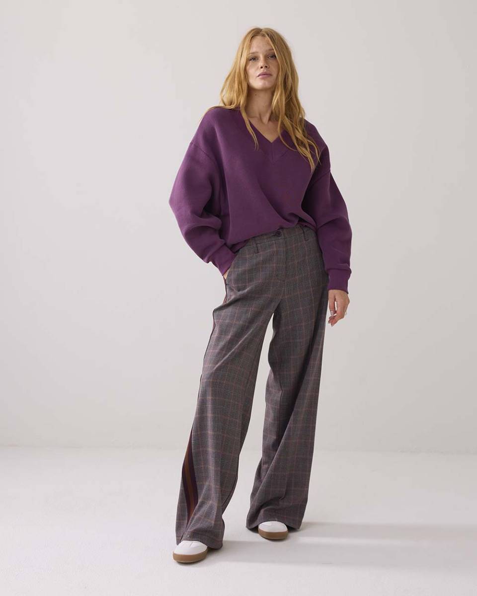 Trendy en comfortabele V-hals sweater in een prachtige wineberry tint van Summum Woman. Gemaakt van een zachte katoenmix met een vleugje elastaan voor extra bewegingsvrijheid. Perfect voor een casual, maar stijlvolle look.