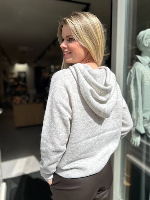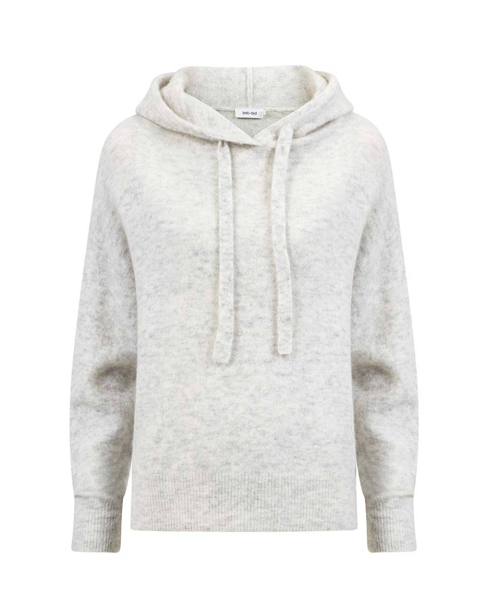 De KNIT-TED Xanthe pullover in lichtgrijs biedt stijlvolle warmte en comfort dankzij de hoogwaardige mix van 32% merinoswol en 32% alpaca. Deze zachte trui is voorzien van een trendy capuchon met trekkoord, perfect voor een casual look.